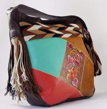 Bolso manos libres con apliques repujados y pintados a mano con tira wuayu